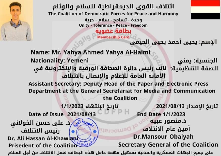 وفي العام الثاني لدراسته بكلية الإعلام، عُين نائبا لرئيس دائرة الصحافة الورقية والإلكترونية في الأمانة العامة للإعلام والاتصال في القوى الديمقراطية للسلام والوئام، التي يقع مقرها الرئيسي في جمهورية مصر العربية.